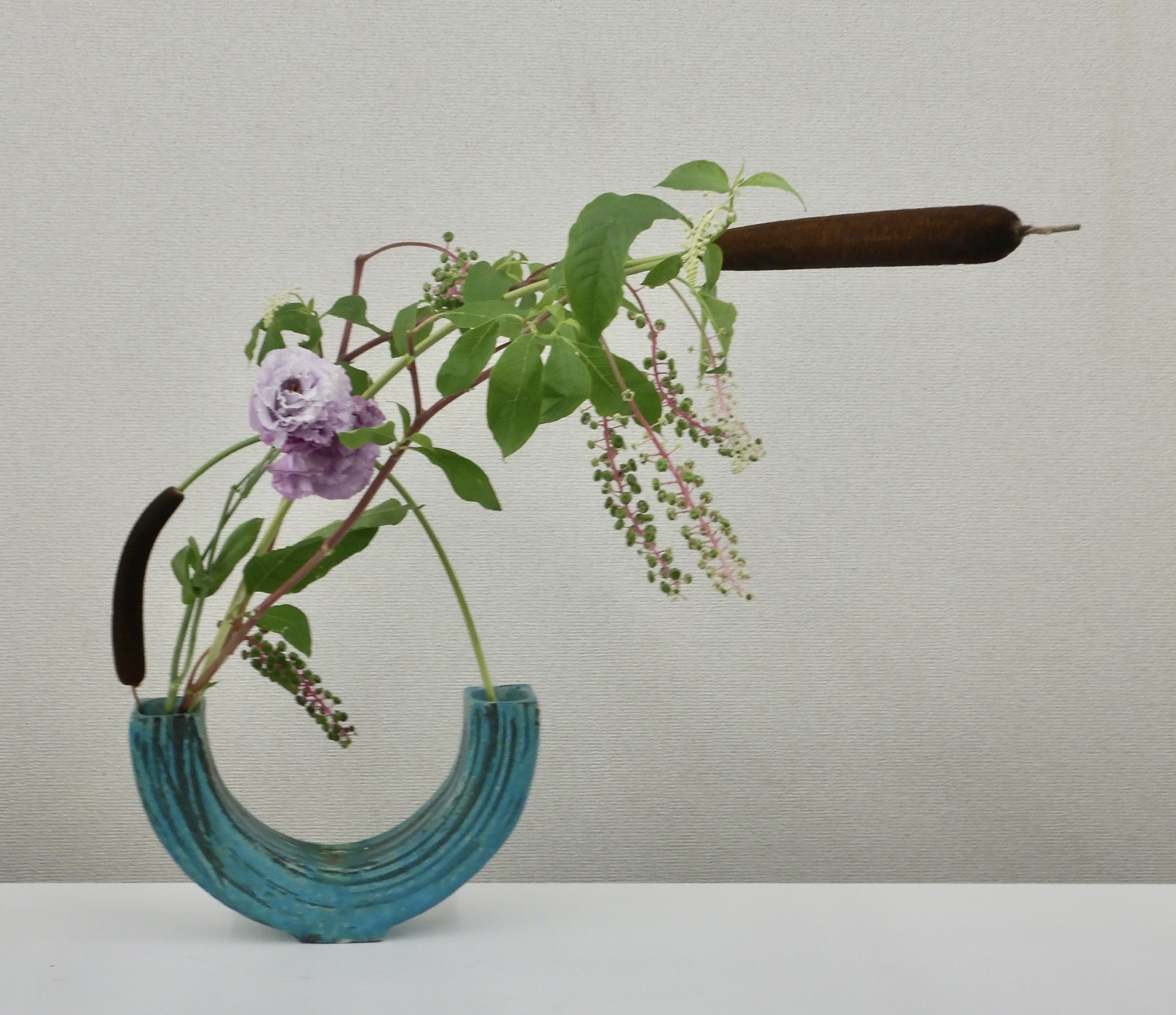 花材(左から) がま[ガマ科]→トルコききょう[リンドウ科]→ようしゅやまごぼう[ヤマゴウボウ科]