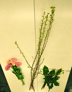 花材(左から) トルコききょう[リンドウ科]使っていません→きばでまり[バラ科]→セローム[サトイモ科] ※ドラセナ[リュウゼツラン科]写真ありません